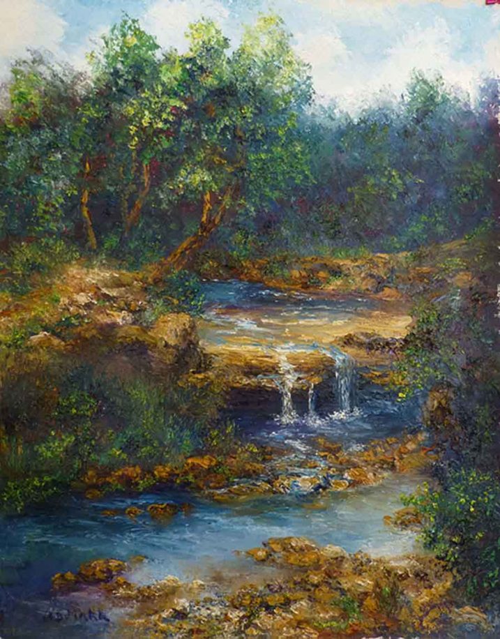 Wondrous Surprise by AB Makk shows a small waterfall tumbling from one level to another. There are trees growing along the shoreline.